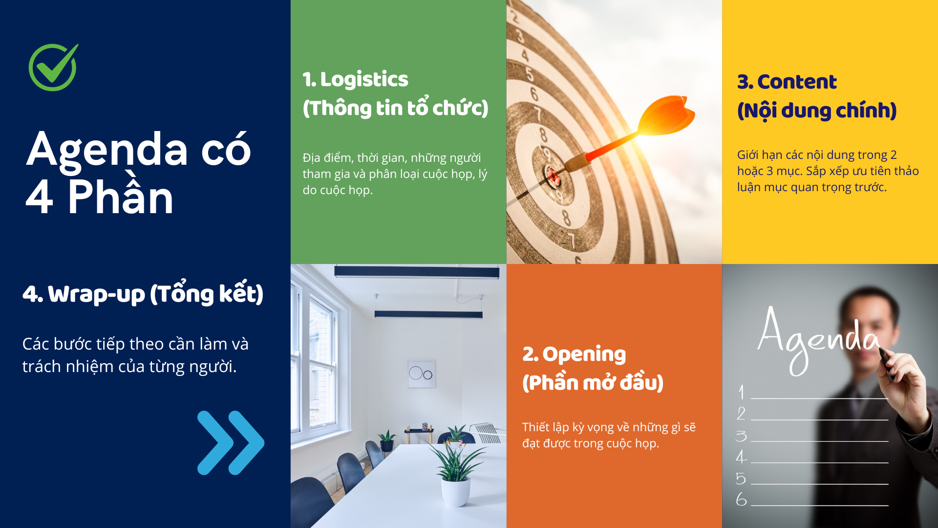 Opening (Phần mở đầu): Phần này là thời gian để mọi người giới thiệu bản thân và thiết lập kỳ vọng về những gì sẽ đạt được trong cuộc họp. Đây cũng là cơ hội để mọi người đóng góp ý kiến nếu có bất kỳ vấn đề quan trọng nào cần bổ sung vào chương trình họp.