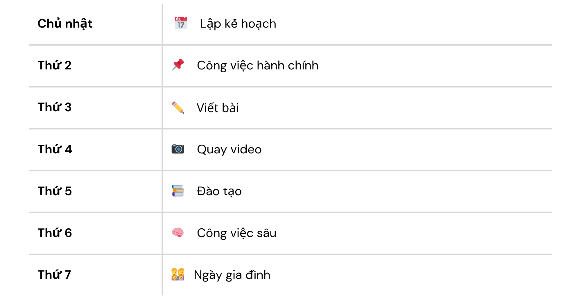 Mike Vardy, người sáng lập Productivityist, sử dụng ngày chủ đề để xác định trọng tâm chính cho mỗi ngày. Dưới đây là cách ông ấy phân chia chủ đề cho tuần của mình: