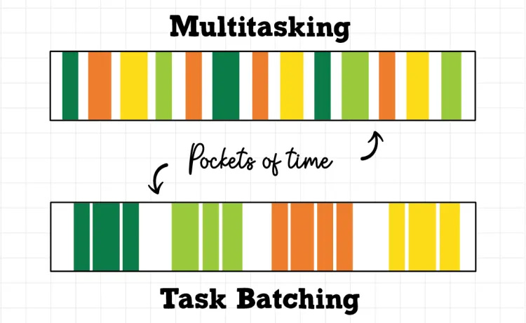 Task batching là khi bạn nhóm các nhiệm vụ tương tự — thường là các nhiệm vụ nhỏ hơn — lại với nhau và lên lịch các khoảng thời gian cụ thể để hoàn thành chúng cùng một lúc. Bằng cách xử lý các nhiệm vụ tương tự trong một nhóm, bạn giảm thiểu việc chuyển đổi giữa các công việc trong suốt cả ngày. Điều này giúp tiết kiệm thời gian và năng lượng tinh thần quý báu.