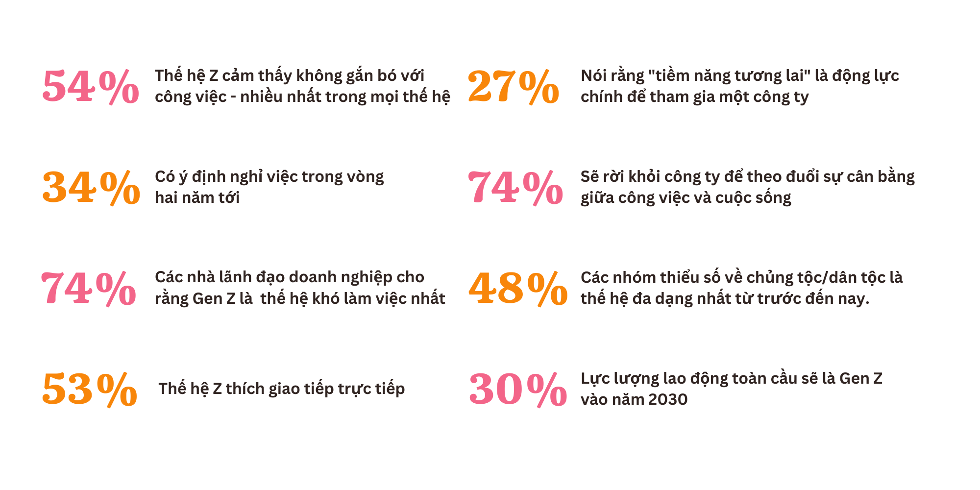 Tuy nhiên, các doanh nghiệp không thể mãi tránh tuyển dụng Gen Z—họ được dự đoán sẽ chiếm 30% lực lượng lao động vào năm 2030. Vậy các tổ chức hiện đại có thể làm gì để vượt qua những thách thức kép trong việc giữ chân, gắn kết và tạo động lực cho một thế hệ mà theo dữ liệu, bị coi là thiếu trung thành, không gắn bó và thiếu động lực?