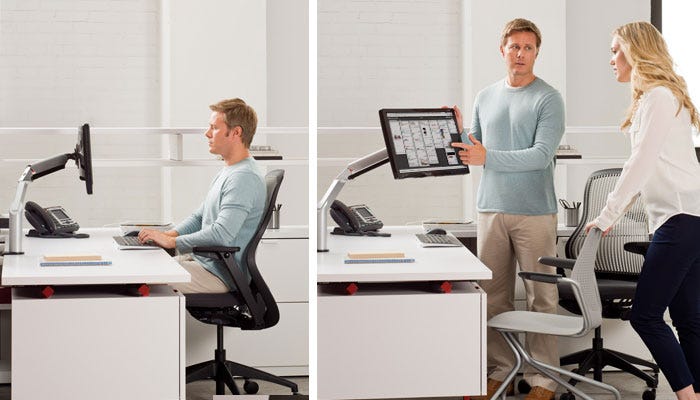 Làm việc ở không gian hỗ trợ cả tư thế ngồi và đứng, như bàn điều chỉnh độ cao, là rất tốt. Nếu không có bàn “ngồi-đứng”, kết hợp các bàn làm việc có cả hai tư thế trong không gian làm việc chính. Bạn có thể đứng trong các cuộc họp, khi gọi điện hoặc đọc sách, và ngồi khi làm việc trên máy tính. Thỉnh thoảng đứng dậy trong ngày làm việc sẽ tốt cho sức khỏe của bạn.